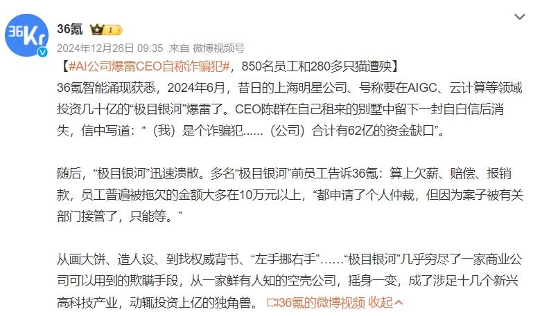 早在2024年6月,国内一家名为“极目银河”的AI领域明星创业公司“财务爆雷”,CEO陈群在自己租来的别墅中留下一封自白信后消失,信中写道:“(我)是个诈骗犯......(公司)合计有62亿的资金缺口”。根据“36氪”报道,这家公司套壳AI等多个数字科技业务以吸纳融资,实际上,公司多年来一直都没有成熟的产品和业务,项目逐渐无法通过融资获利,最终整个公司走向破产。