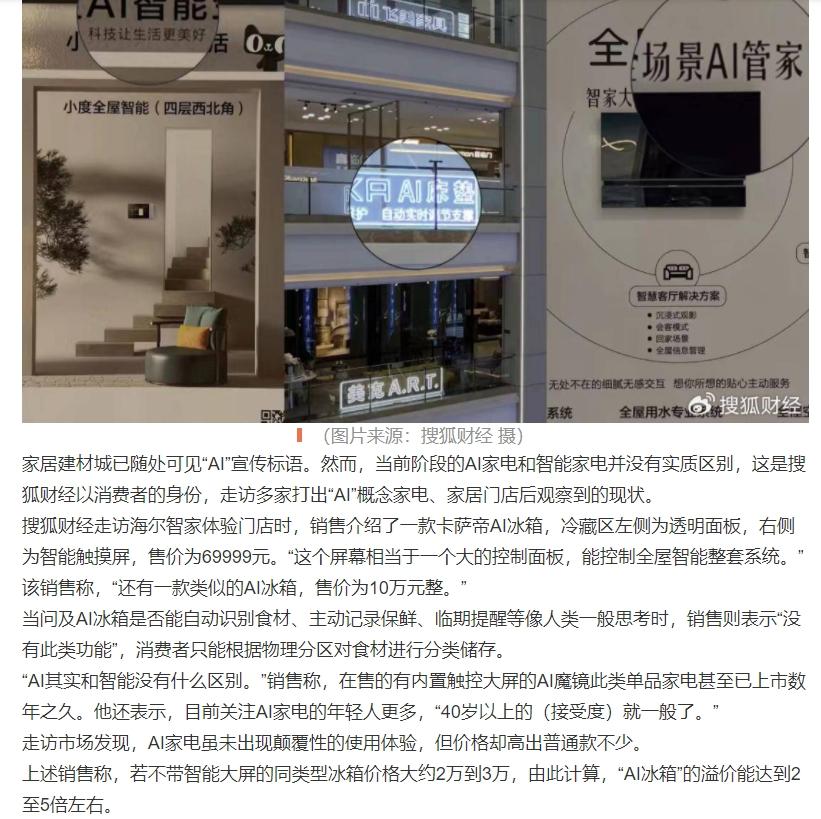 体验升级不多,但不少融合AI概念产品的价格却先涨了上来。有售卖卡萨帝AI冰箱的销售人员对“搜狐财经”表示,目前AI其实和智能没有什么区别,暂时还做不到帮助用户识别食材、记录保鲜、临期提醒等等。然而,其店内两款AI冰箱产品售价分别为6.9万元和10万元,相比之下不带智能大屏的同类型冰箱价格大约2万到3万;由此计算,“AI冰箱”的溢价能达到2至5倍左右。
