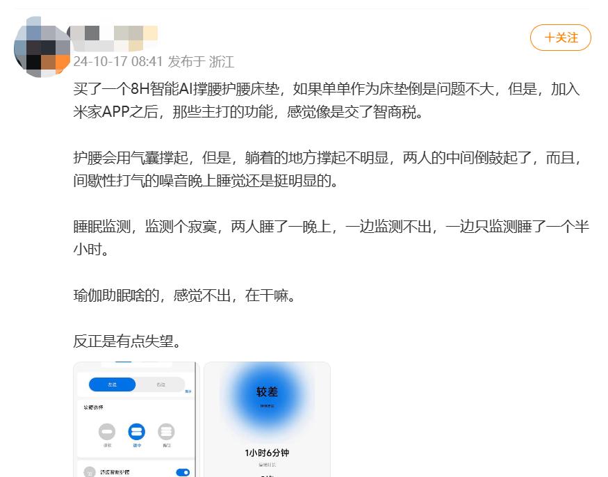 然而,在很多消费者看来,这些家电的AI功能解决的并不是核心痛点,而且实际使用上也达不到宣传中的智能。某品牌AI床垫的用户表示,护腰气囊晚上间歇性打气噪音不小,睡眠监测时间也不太准确,“感觉像是交了智商税”。