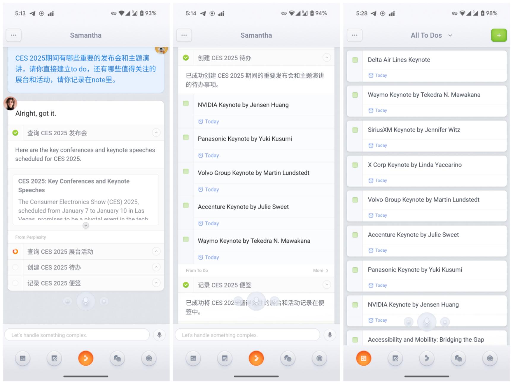 AI Assistant 会分别查询 CES 2025 期间的发布会、展台活动,并基于此筛选并建立相应的笔记和待办清单。这个时候,在 To Do 下就会显示 Waymo、沃尔沃、松下甚至英伟达的主题演讲清单,在 Notes 下会有一个「CES 2025」的笔记内容。
