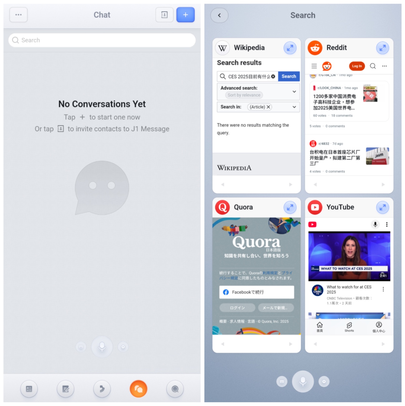 这套「Ripple Touch(波纹触摸)」的设计也被用于 J1 Assistant 最核心的 AI 助手交互上。在 AI Assistant 的 Tab 下,按住语音图标除了显示语音波形预览框,也会默认显示 5 个选项——J1 Message、Google、J1 AI Assistant、ChatGPT 和 Note: