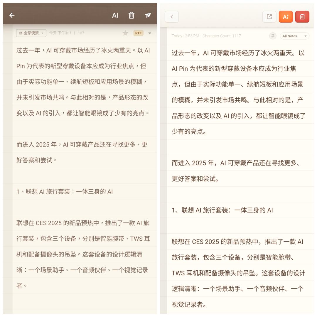 左:锤子便签;右:J1 Assistant 的 Notes,图/雷科技