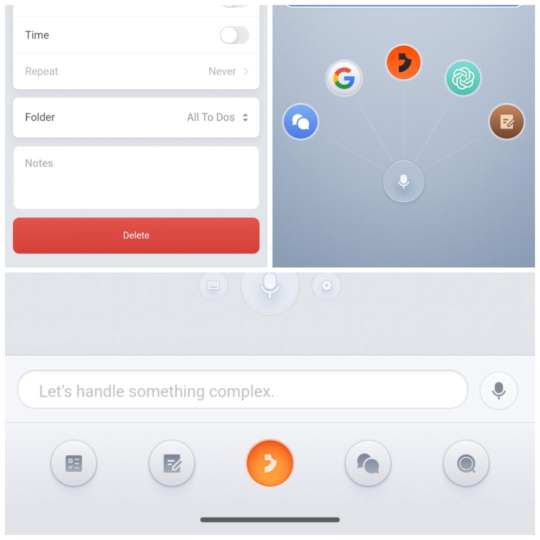 交互上的亮点前文已经提出,同样一段话可以在五个来源之间灵活地进行选择,换言之,用户可以下意识直接按住说话,再考虑是问 AI 以及问哪个 AI,还是保存成笔记或者发送给好友。