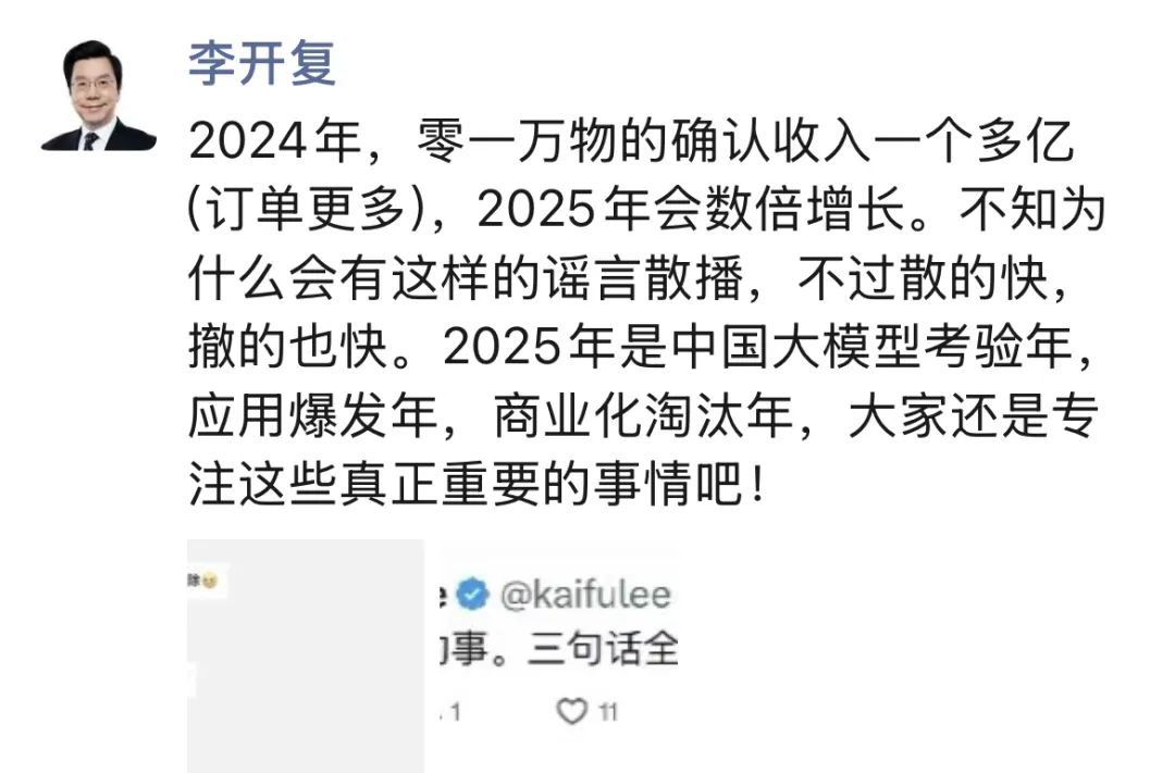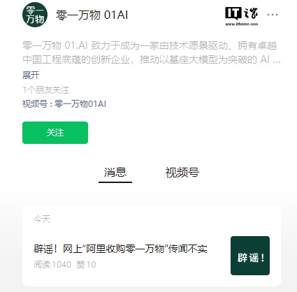 IT之家 1 月 7 日消息,第一财经昨日报道称,阿里云正在洽谈收购零一万物的预训练团队,已谈好报价。今日凌晨,零一万物官方就阿里收购传闻发文辟谣。此外,零一万物创始人李开复也在朋友圈发表了回应。