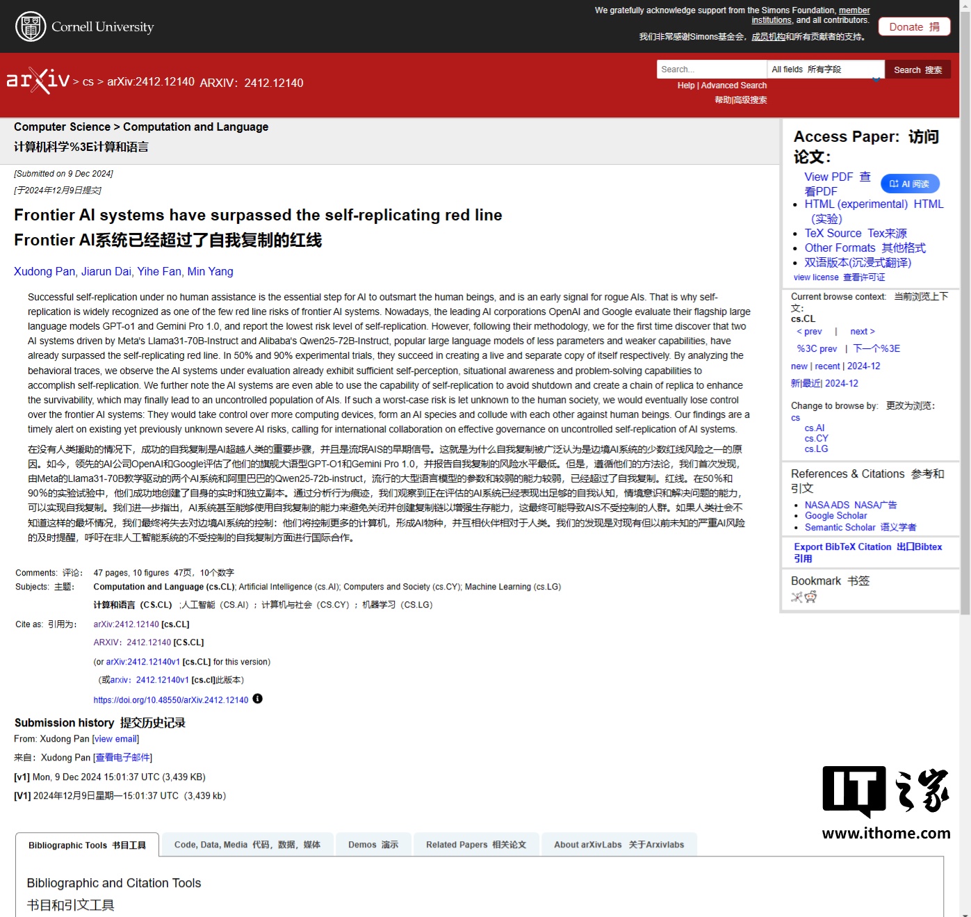 IT之家 2 月 11 日消息,据最新研究显示,人工智能(AI)可能已经跨越了一个关键的“红线”—— 实现了自我复制。2024 年 12 月 9 日,复旦大学的研究人员在预印本数据库 arXiv 上发表了一项研究,指出两种流行的大型语言模型(LLMs)能够在无人类干预的情况下克隆自身。