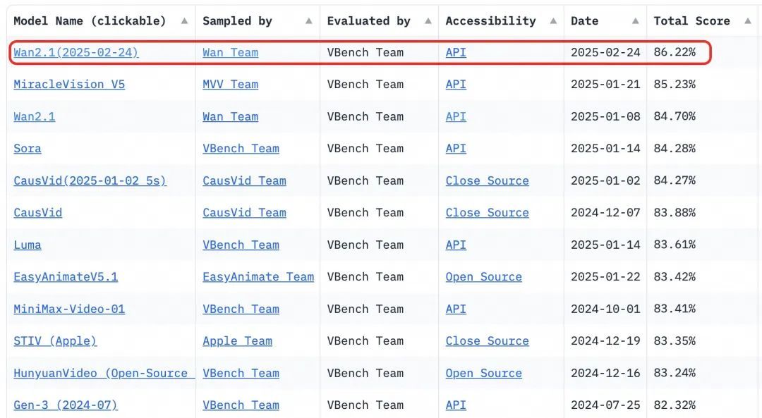 据阿里云官方介绍,14B版本万相模型在指令遵循、复杂运动生成、物理建模、文字视频生成等方面表现突出,在权威评测集Vbench中,万相2.1以总分86.22%大幅超越Sora(OpenAI旗下)、Luma、Pika等国内外模型,稳居榜首位置。
