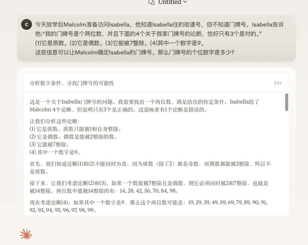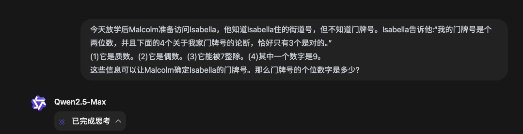 问它一道数学竞赛真题,最后的答案倒是对了,就是思考时间稍微久了些,我粗略估计思考了得有两分钟出头。