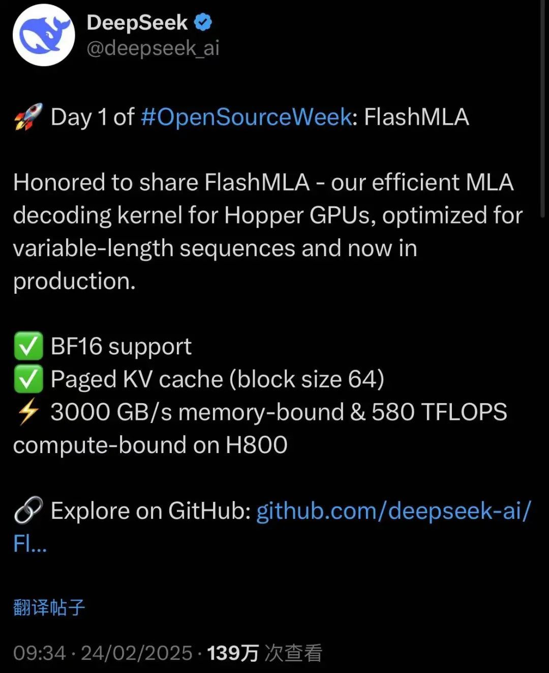 第一天,整了个 FlashMLA ,这玩意儿专门针对英伟达的 Hoppers GPU ( 比如 H100 、 H800 ),进行了效率优化,通俗点说就是榨干 GPU 的最后一滴性能。