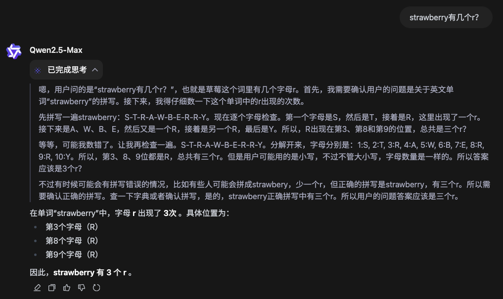 这道题问 DeepSeek R1 ,它的思考过程跟 QwQ 很相似,也是分析了多种可能性,但 R1 胜在推理的速度稍微快一些( 112 秒 )。