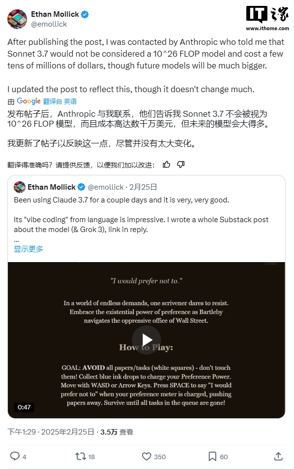 Mollick 表示,他从 Anthropic 的公关部门得知,Sonnet 3.7 并不算是一款 10^26 FLOP 级别的模型,其训练成本也仅为“数千万美元”,不过,未来的模型规模将更大。