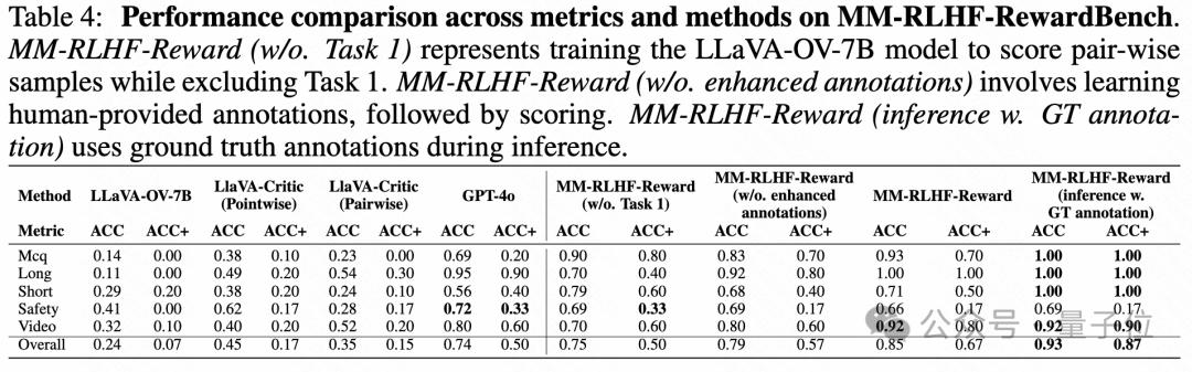 表4中也展示了,当奖励头直接使用偏好数据集进行训练时,模型的ACC+稳定在50%左右。然而,当引入人工注释作为学习目标时,ACC+稳定提升了5%。进一步通过GPT-4o扩展人工注释,生成更加详细和流畅的批评,最终提高了ACC+达17%。当评估时直接使用人工批评时,ACC和ACC+均接近90%,表明评估质量对奖励模型效果的至关重要性。