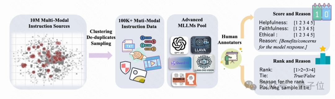 数据过滤与模型响应生成, 通过预定义的多选题,长文本等类别均匀采样,确保少数类也有足够的样本。同时采用了knn聚类并采样的策略,保证数据的diversity。响应生成使用到了Qwen2-VL-72B、LLaVA-OV-72B、GPT-4o 和 Claude 3.5-sonnet等最先进的MLLM。