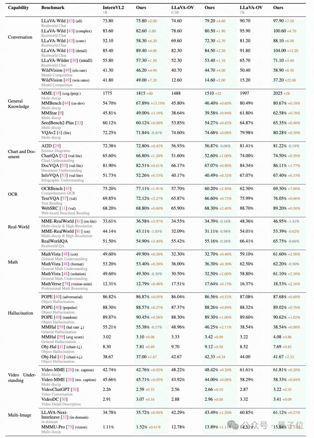 在幻觉、数学推理、多图像和视频理解方面的广泛提升:对齐后的模型在这些领域表现出显著的提升。有趣的是,尽管数据集中缺乏专门的多图像数据,模型在多图像任务中的表现依然显著提升。这表明数据集的多样性有助于模型在多个维度上进行更好的泛化。