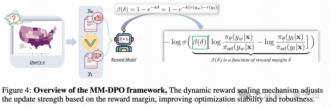 为了解决这个问题,MM-DPO 引入了动态奖励缩放(Dynamic Reward Scaling)机制,根据奖励差距动态调整更新强度,优先利用高置信度的样本对。