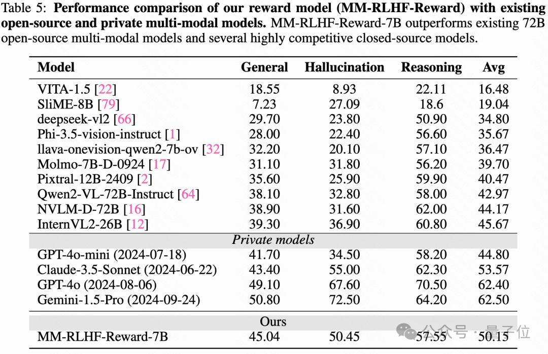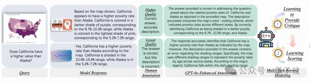 创新的奖励模型:提出了基于批评的奖励模型(Critique-Based Reward Model),该模型首先对模型输出进行批评,然后再进行评分。这一方法相比传统的标量奖励机制,提供了更好的可解释性和更有信息量的反馈,基于该方法的模型只需要7B size,在reward model benchmark就明显优于现有公开的72B-size的MLLM。