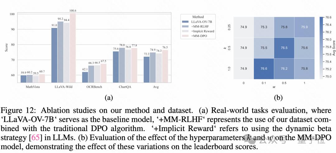 模型对数据和超参数的偏好差异:不同模型在对齐过程中表现出不同的性能趋势,并且在不同基准上对超参数设置的偏好也各不相同。例如,在对InternVL-1B的训练中,发现排除SFT损失函数反而带来了更好的结果。此外,虽然InternVL-1B在常识知识任务中表现出显著改进,但在OCR任务中的相对提升不如LLaVA-OV系列。这些差异主要源自模型预训练数据集和策略的不同,因此需要根据具体模型对超参数进行定制化调整以获得最佳对齐效果。