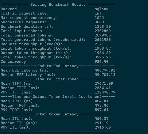 1024路并发性能测试日志,测试使用了1000/1000的输入输出长度,实现了3975.76 tokens/s的总设备吞吐