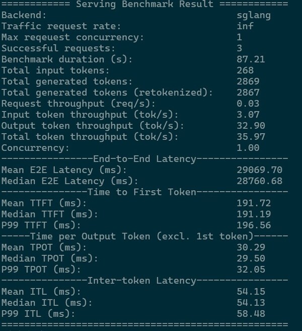 单路并发性能测试日志,根据TPOT换算用户解码性能为33.3 tokens/s