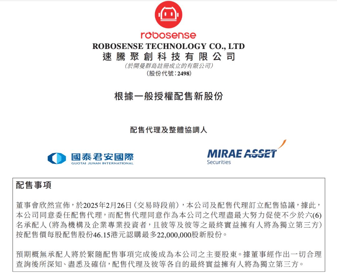 2月26日,速腾聚创发布公告显示,公司及配售代理订立配售协议,拟透过配售代理配售最多2200万股新股,每股配售股份份46.15港元。