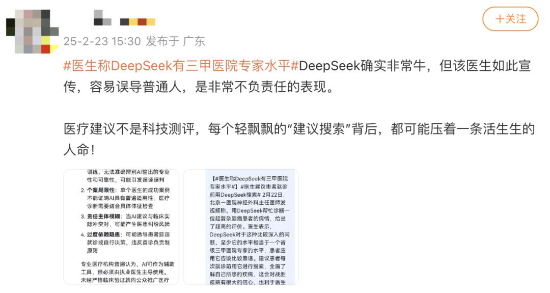 比如,微博网友就发帖称,「医生称 DeepSeek 有三甲医院专家水平」这种宣传很容易误导普通人,要知道每个「建议搜索」背后都压着一条活生生的人命。