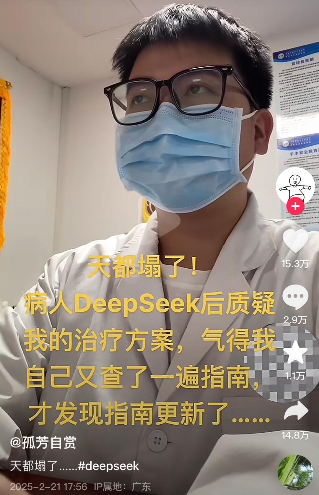 最近,广东一医学博士「孤芳自赏」发视频称,有患者拿着 DeepSeek 给出的治疗方案来质疑自己,气得他又去查了一遍指南,结果发现: