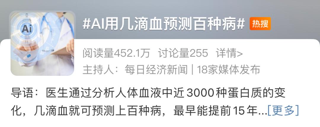 就是抽几滴血,然后医生用 AI 算法,对着血液里近 3000 种蛋白质的变化一通分析,就能预测疾病。
