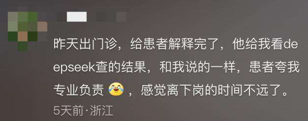 出门诊给患者解释完病情,患者说跟 DeepSeek 查的结果一样,还夸他专业负责。