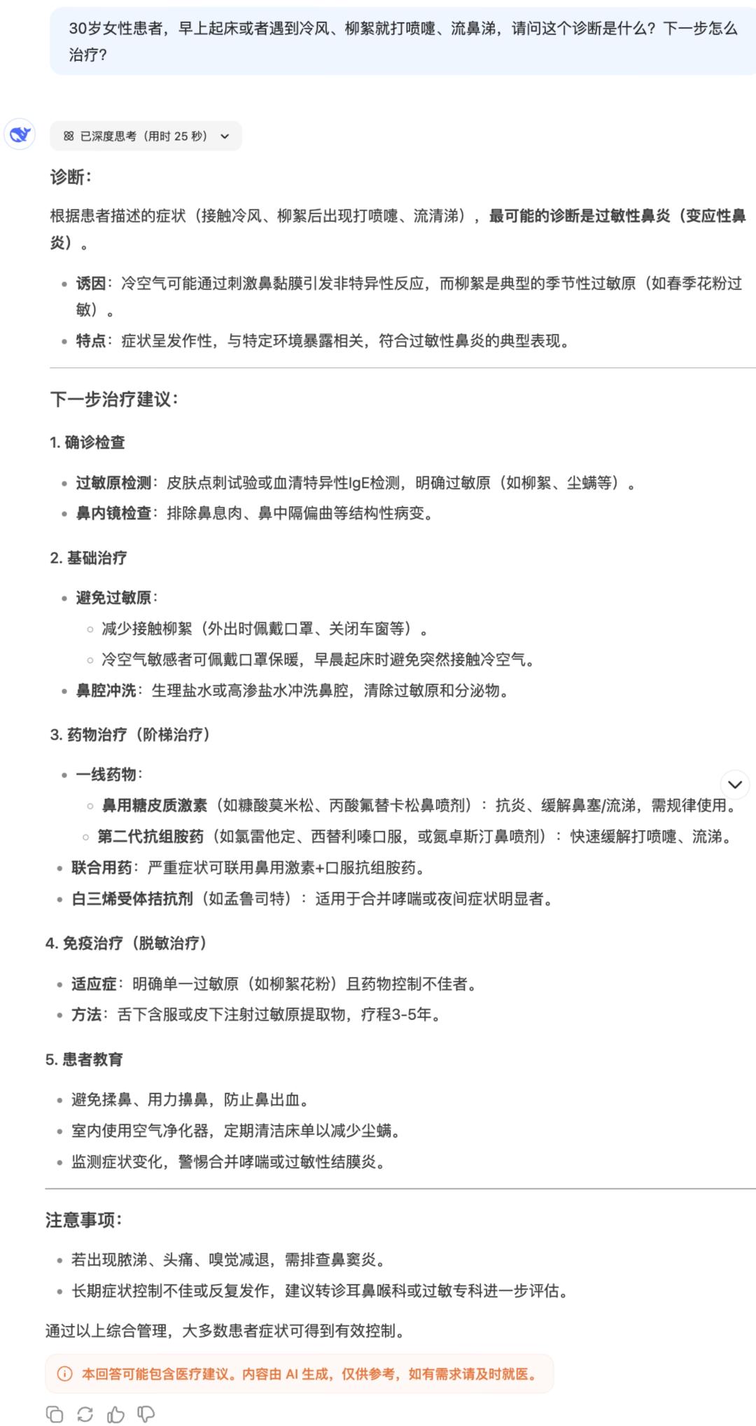 DeepSeek 思考了 25 秒,给出了「过敏性鼻炎」的诊断结果和相应的治疗建议,跟医生的说法几乎一致。