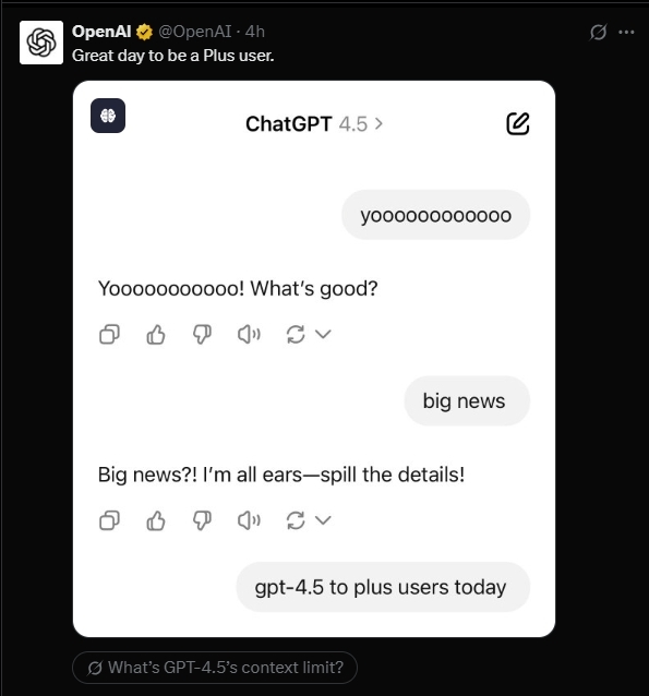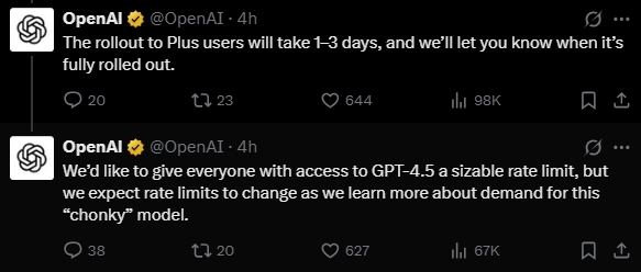 凤凰网科技讯 3月6日,OpenAI宣布GPT-4.5正式向所有Plus用户开放。OpenAI表示,全量开放预计需要1-3天,上线初期服务器可能略微卡顿。