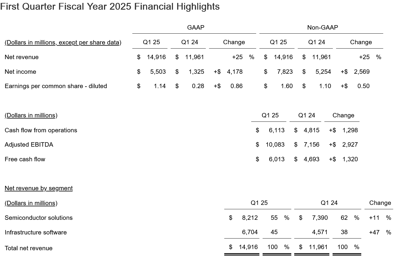IT之家 3 月 7 日消息,博通美国当地时间 6 日美股收盘后公布了 2025 财年第一财季(截至 2025 年 2 月 2 日)的财务数据。在该季度中博通实现 149.16 亿美元(当前约 1080.88 亿元人民币)营业收入,较去年同期增长 25%,环比则增长了 6%。