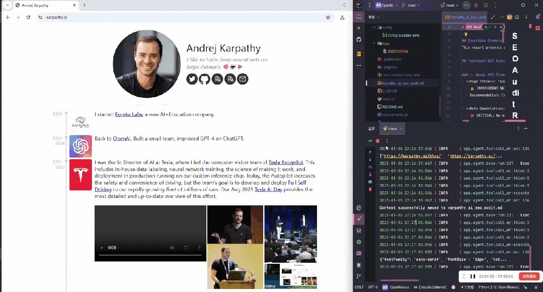 比如,我们可以给OpenManus这样一个任务:「对Karpathy的网站(https://karpathy.ai/)进行全面的SEO审核,并提供详细的优化报告,包括可执行的改进建议。」