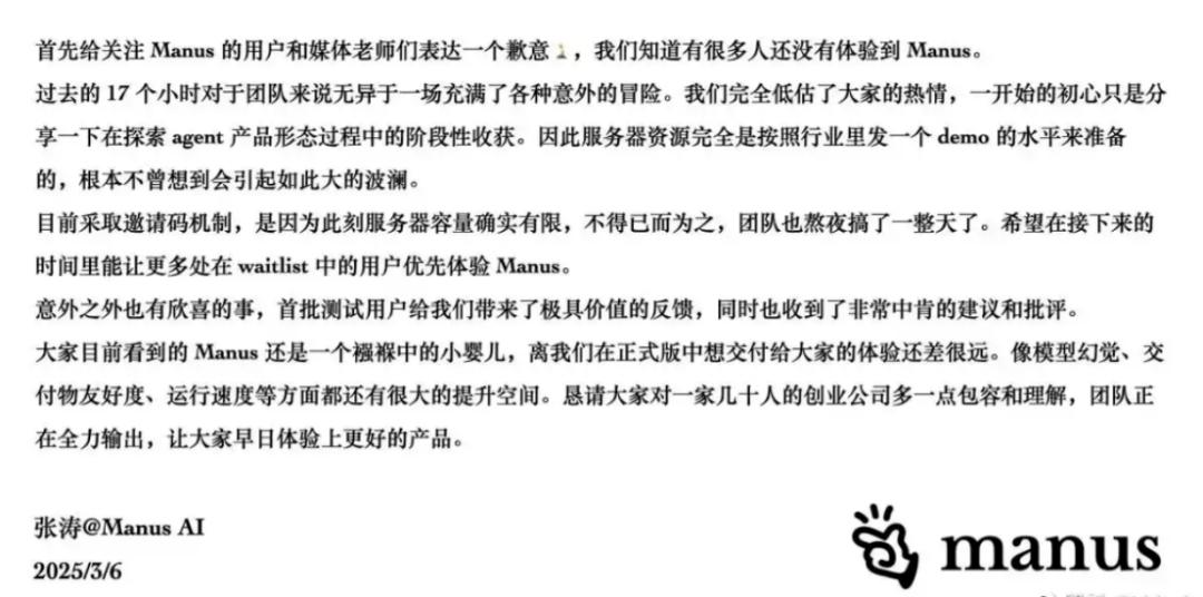 3月6日Manus团队也发了声明,没想到那么火,目前服务器容量还有限,接下来提升空间还很大,团队会努力让等待体验的用户尽快体验,希望大家不要过度炒作。