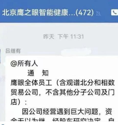 类似的还有医疗行业AI医疗企业鹰眼智慧中医突然宣布解散。网传截图显示,鹰眼智慧中医战略管理部总经理兼总裁办公室主任吕继有,在企业微信全员群里发布了解散通知,全体员工解聘。