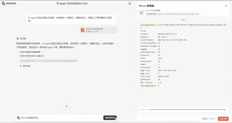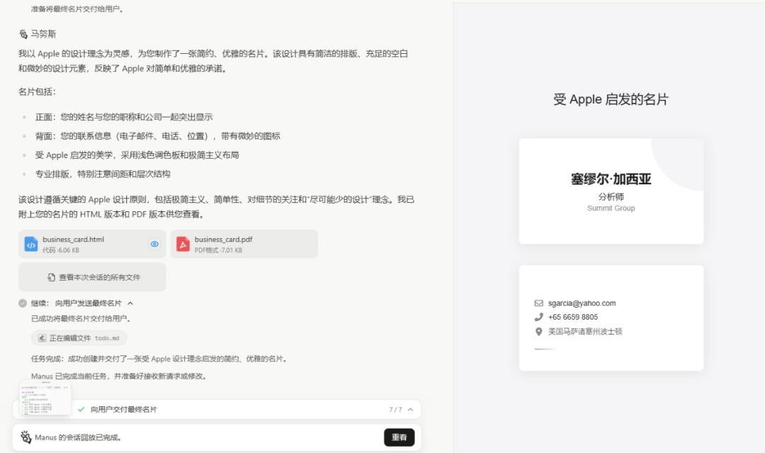 阿强只需要把“生成苹果风名片”的需求和客户资料发给对方,manus就会给自己建立任务清单,在抓取关键信息、学习苹果风设计理念后自动生成内容,帮阿强省去打磨提示词、手动切换平台等一系列繁琐的工作流程。