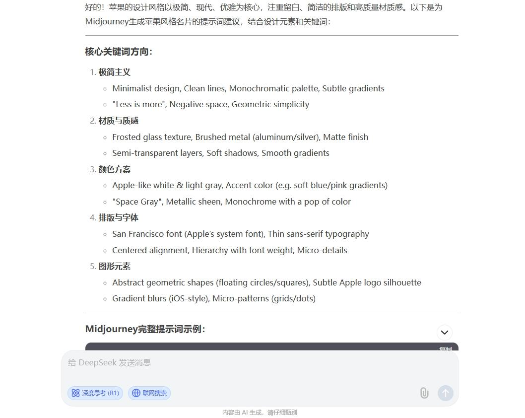 在过去,阿强会先手动学习苹果风的概念,然后根据自己的思路实现从0到1的设计与生产;在AI出现后,阿强会先和DeepSeek互动得到“苹果风作图提示词”,然后交给Midjourney通过提示词“炼丹”得到成果反馈。