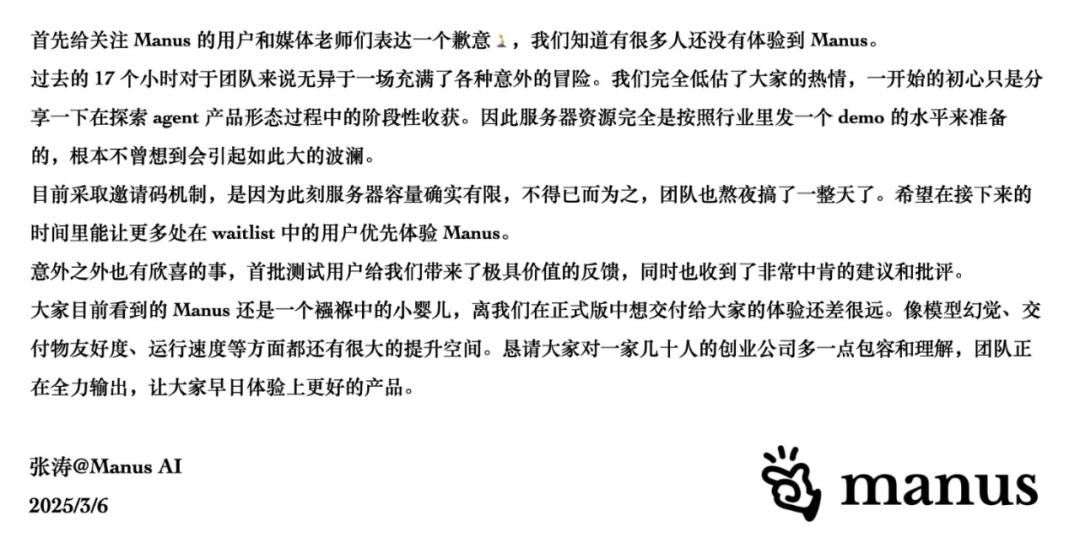 “我们完全低估了大家的热情,一开始的初心只是分享一下在探索agent产品形态过程中的阶段性收获,因此服务器资源完全是按照行业里发一个demo的水平来准备的,根本不曾想到会引起如此大的波澜。”