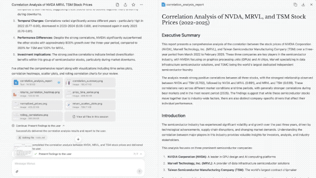 不只处理能处理日常琐事,Manus还能变身股票分析师。比如,对英伟达、迈威尔科技,以及台积电在过去3年的股票价格之间的相关性展开分析,再通过API访问权威数据源,编写用于数据分析与可视化的代码......