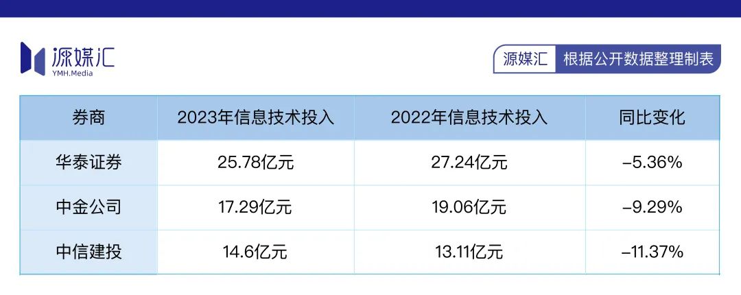 源媒汇统计发现,2019年至2023年,5年时间,华泰证券的信息技术投入合计达到111.7亿元。