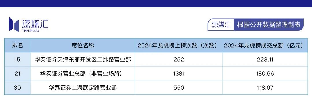 交易席位的战绩,也佐证了华泰证券受股民追捧的程度。在2024年龙虎榜成交额排名前50的券商营业部中,华泰证券有3家营业网点入围。3家营业网点每年的成交金额,经常大幅超过大部分券商分公司每年的成交金额。