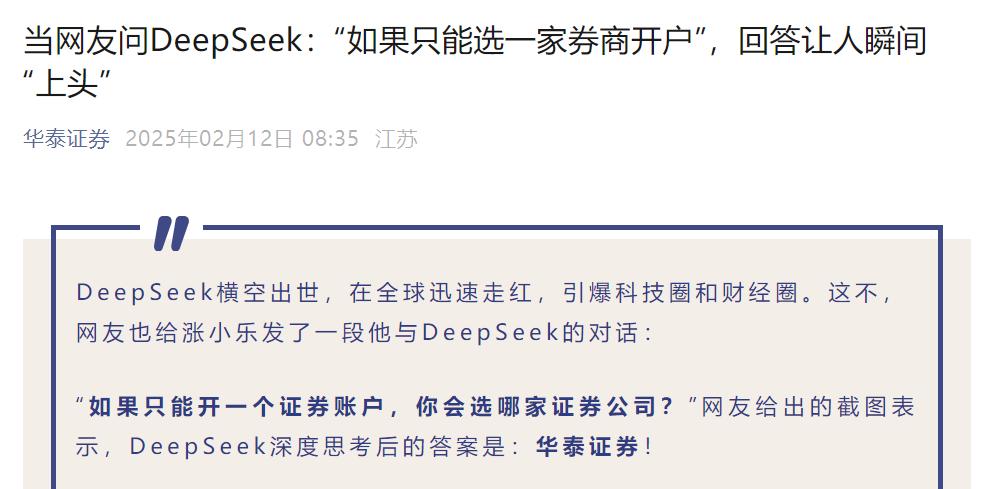 近日,华泰证券官方微信公众号上发布了一个对话梗,一位网友问DeepSeek“如果只能开一个证券账户,你会选哪家证券公司?”DeepSeek深度思考后的答案是“华泰证券”。