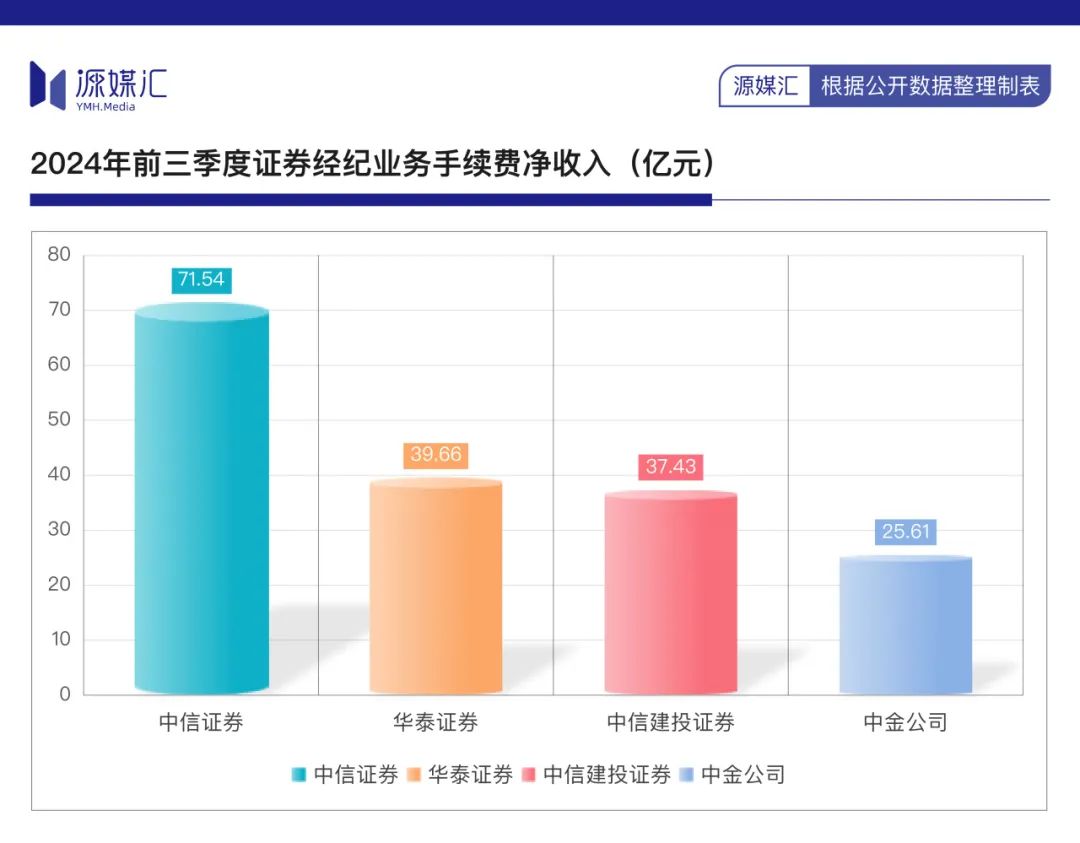 据Wind数据,2024年前三季度,华泰证券实现营业收入314.24亿元、归母净利润127.38亿元,同比增速分别达到15.41%、30.13%,与“一哥”中信证券的差距进一步缩小。其中,证券经纪业务手续费净收入39.66亿元,在“三中一华”中排名第二。