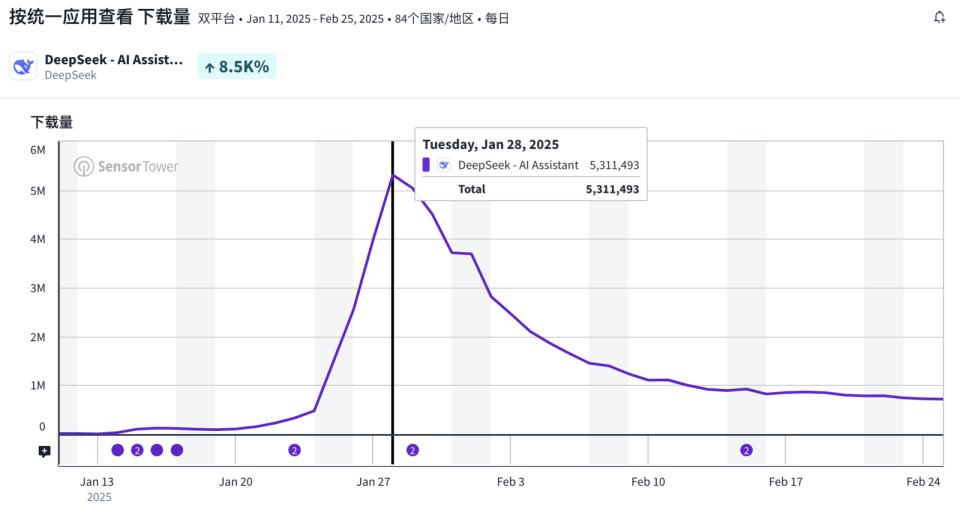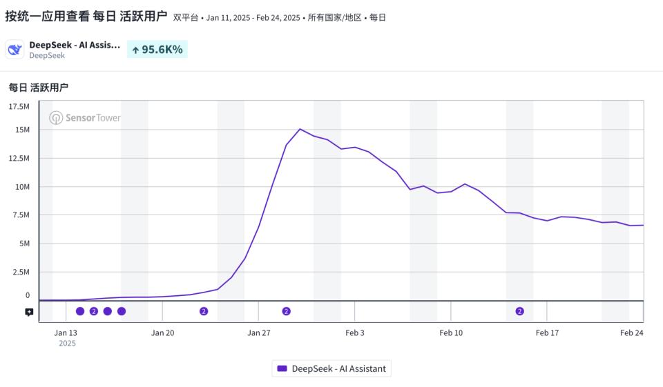 根据SensorTower数据,截至2025年2月24日,DeepSeek移动端近30天的平均日活为950万,2月24日日活接近700万,对比2月初1500万的峰值数据,数据接近砍半。