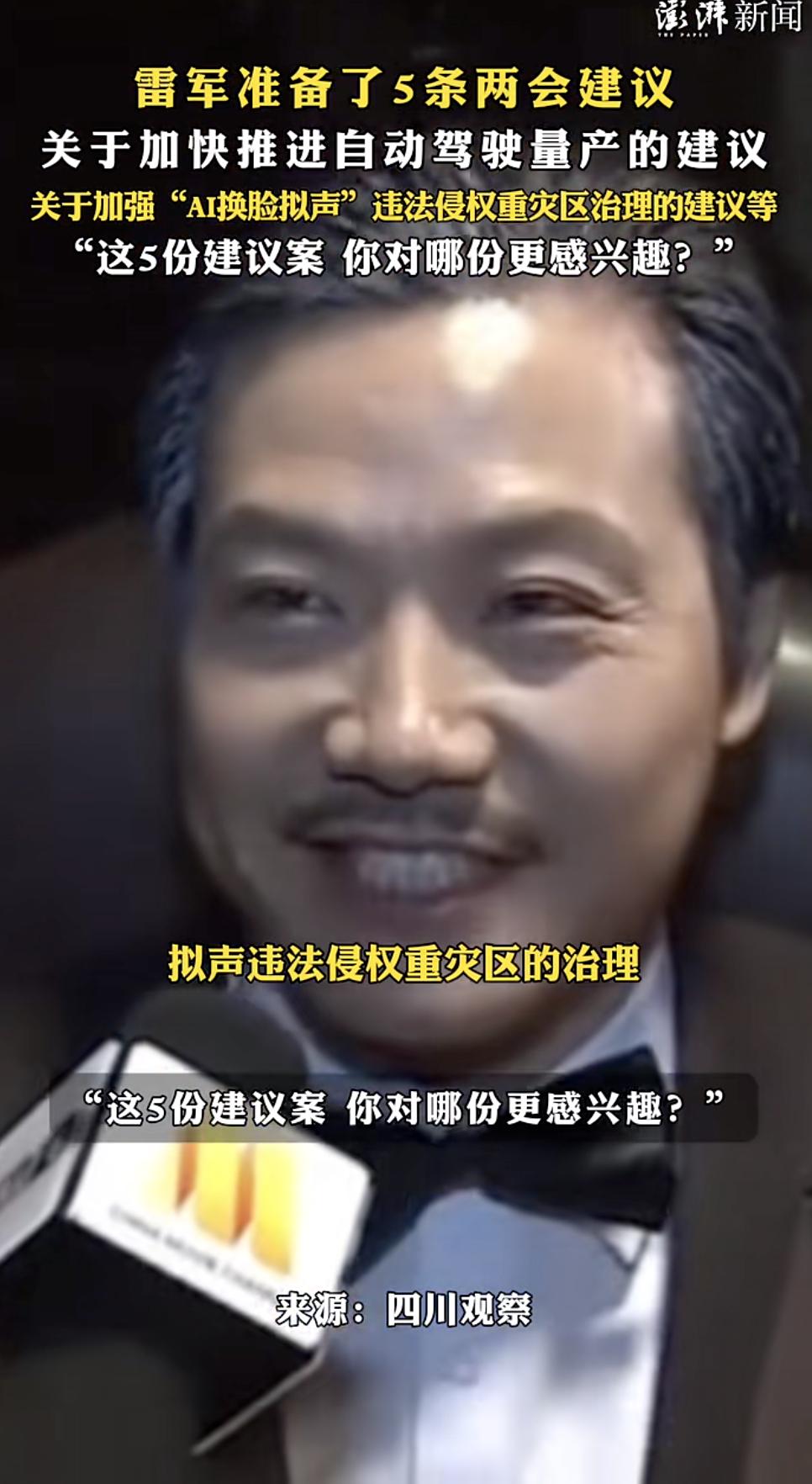 一个是技术滥用风险。雷军今年两会给出5份提案,其中一份便是《关于加强“AI换脸拟声”违法侵权重灾区治理的建议》