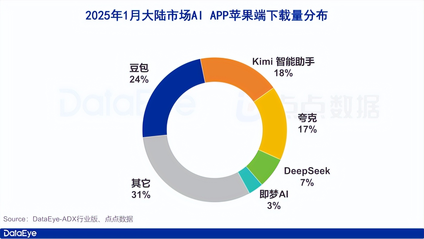 根据点点数据,2025年1月,中国区苹果应用商店AI APP的预估下载总量达2370.7万,其中豆包、Kimi、夸克、DeepSeek和即梦AI位列TOP 5,占据了大盘的69%。