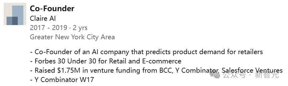 2017年,他曾共同创办了一家专注于为零售商预测产品需求的AI公司,并从BCC、Y Combinator和Salesforce Ventures获得175万美元风险投资。