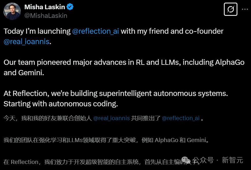 近日,由DeepMind近12年老将、做出AlphaGo/AlphaZero/MuZero等项目的超级天才Ioannis Antonoglou,和Gemini强化学习的核心负责人Misha Laskin,联合成立的初创Reflection AI终于浮出了水面。