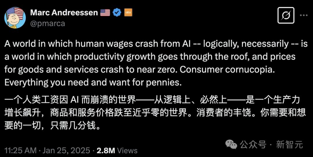 风投大佬Marc Andreessen最近在X上发帖称,在AI时代,工资「逻辑上、必然地」会暴跌,但AI也会通过将「商品和服务」价格降至「接近零」来解决问题。(他并未解释这如何实现。)