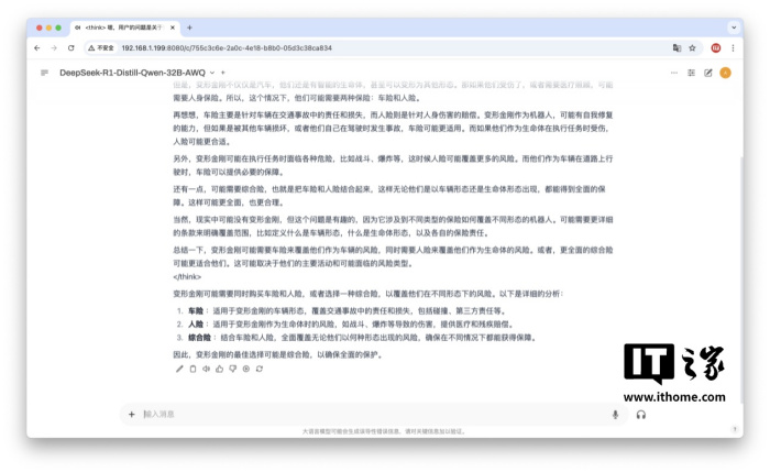 面对二选一的提问,32B 的 DeepSeek R1 并没有死板的做出选择,其理解了变形金刚不同形态的特征给出了两种保险都买的绝佳选择。