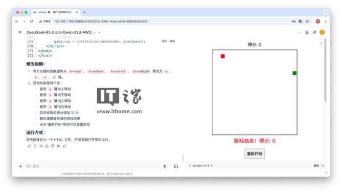 因为是 32B 的模型,所以我们直接上强度,让模型帮我们写一个 HTML 小游戏。我们首先对模型进行提问:
