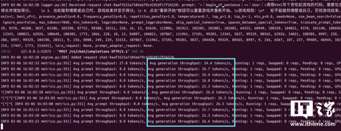 DeepSeek R1 开始分析问题并生成代码,此时两张 Arc A770 显卡的风扇全力运转,后端显示 Avg Generation Throughput 可以稳定在 26 tokens / s 以上。对比之下,单张 RTX 5090 D 运行 32B 模型的性能大约为 46 tokens / s,而官方不到两成的价格却得到了五成以上的性能,这个表现还是很让人惊喜的。